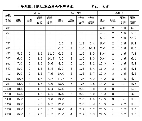 超高钢丝网骨架聚乙烯多层膜片复合管规格表 (单位:毫米)