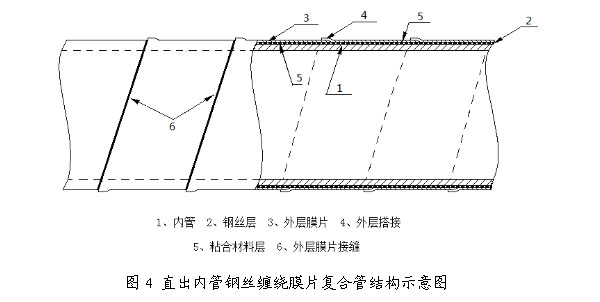 超高分子钢丝网骨架聚乙烯复合管材由直出内管、钢丝和外层膜片三种材料复合而成,适用于大、中口径的中、高压管。管材在生产时先在超高管材挤出机上直接挤出改性BB手机网内管,然后再在内管上热熔复合钢丝和超高膜片。管材结构如图4所示。